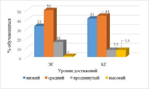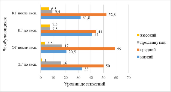 Полученные данные свидетельствуют о том, что позитивные изменения в экспериментальной группе произошли преимущественно за счёт перехода учащихся с низкого и среднего исходного уровня на более высокие. Этот факт является эмпирическим подтверждением эффективности разработанной педагогической модели. Сравнительный анализ результатов позволяет сделать вывод о положительной динамике сформированности образовательных результатов (средний, высокий и продвинутый уровни), которые после проведения эксперимента составили 70 % в экспериментальной группе.