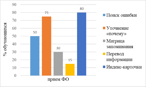 Анализ результатов апробации педагогической модели выявил дифференцированную эффективность применяемых методов формирующего оценивания. Наибольшую результативность продемонстрировали приёмы «Уточнение «почему»» и «Индекс-карточки», с которыми успешно справились 75% и 80% обучающихся соответственно. В то же время, задание в рамках приёма «Перевод информации» вызвало у испытуемых значительные затруднения. Можно предположить, что данное обстоятельство обусловлено недостаточным уровнем сформированности умения осуществлять индуктивное обобщение — преобразование частной информации в общие выводы. Таким образом, в рамках экспериментальной группы приёмы «Уточнение «почему»» и «Индекс-карточки» были определены как наиболее эффективные инструменты формирующего оценивания [1].