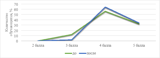 Сравнительный анализ результатов (рис.4) показал положительную динамику. До экспериментальной серии демонстраций оценку «удовлетворительно» (3) получили 12% учащихся, «хорошо» (4) — 56%, «отлично» (5) — 32%. После проведения опытов распределение изменилось: 2%, 64% и 34% соответственно.