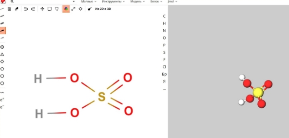 На рисунке 1 представлен результат работы с программой для 3D-моделирования MolView. Данная программа трансформирует структурную формулу молекулы в трёхмерную модель. Для примера была взята молекула серной кислоты.