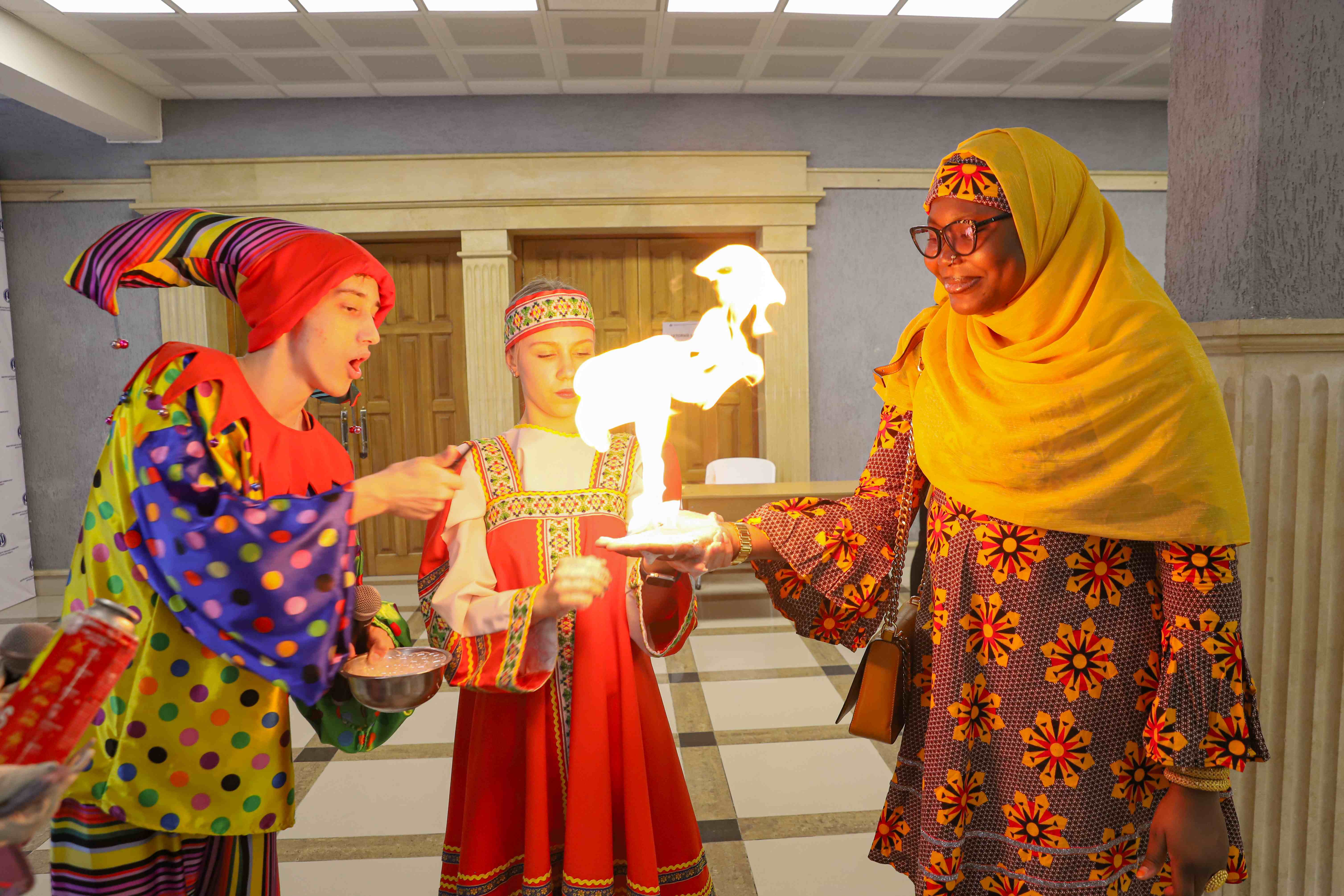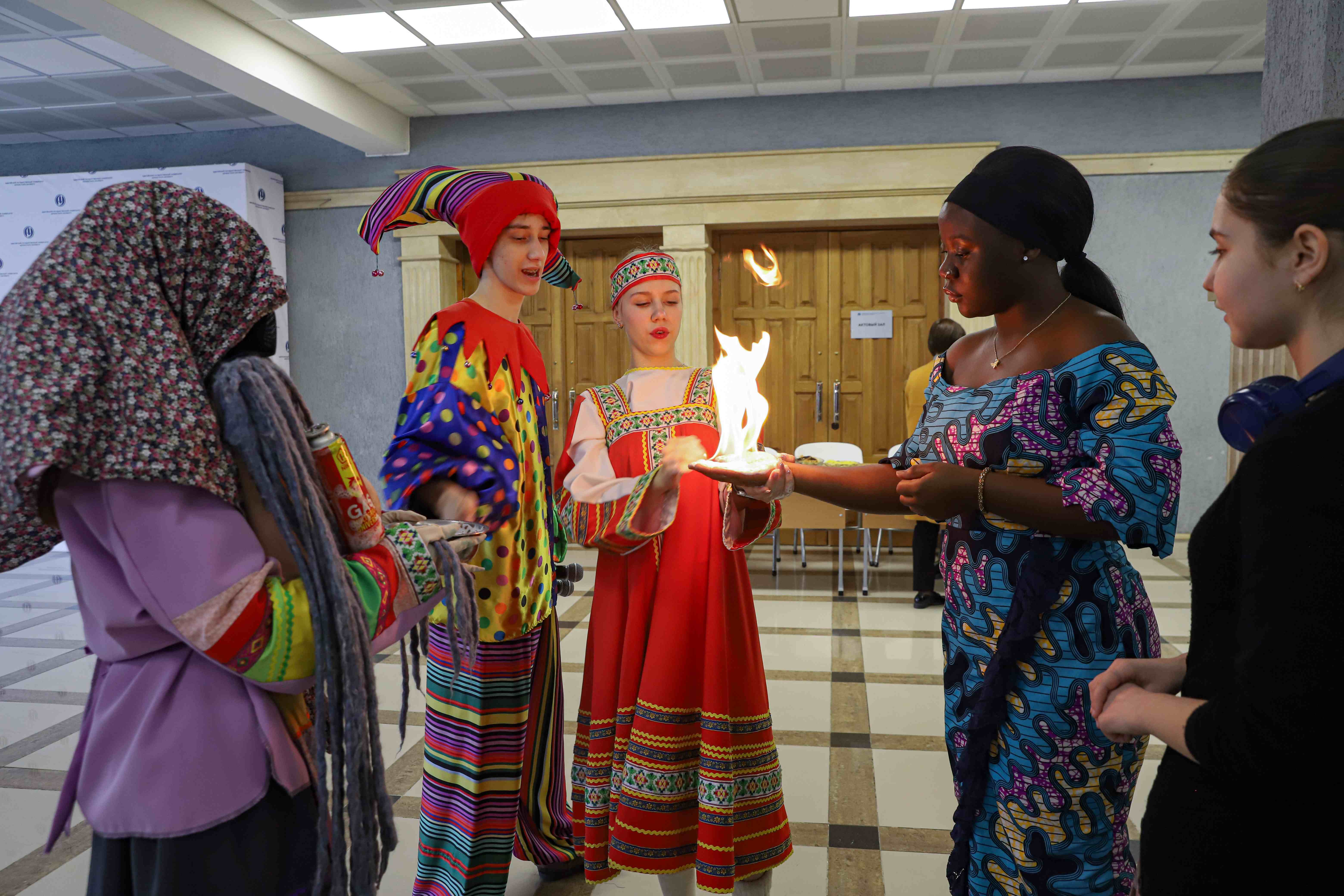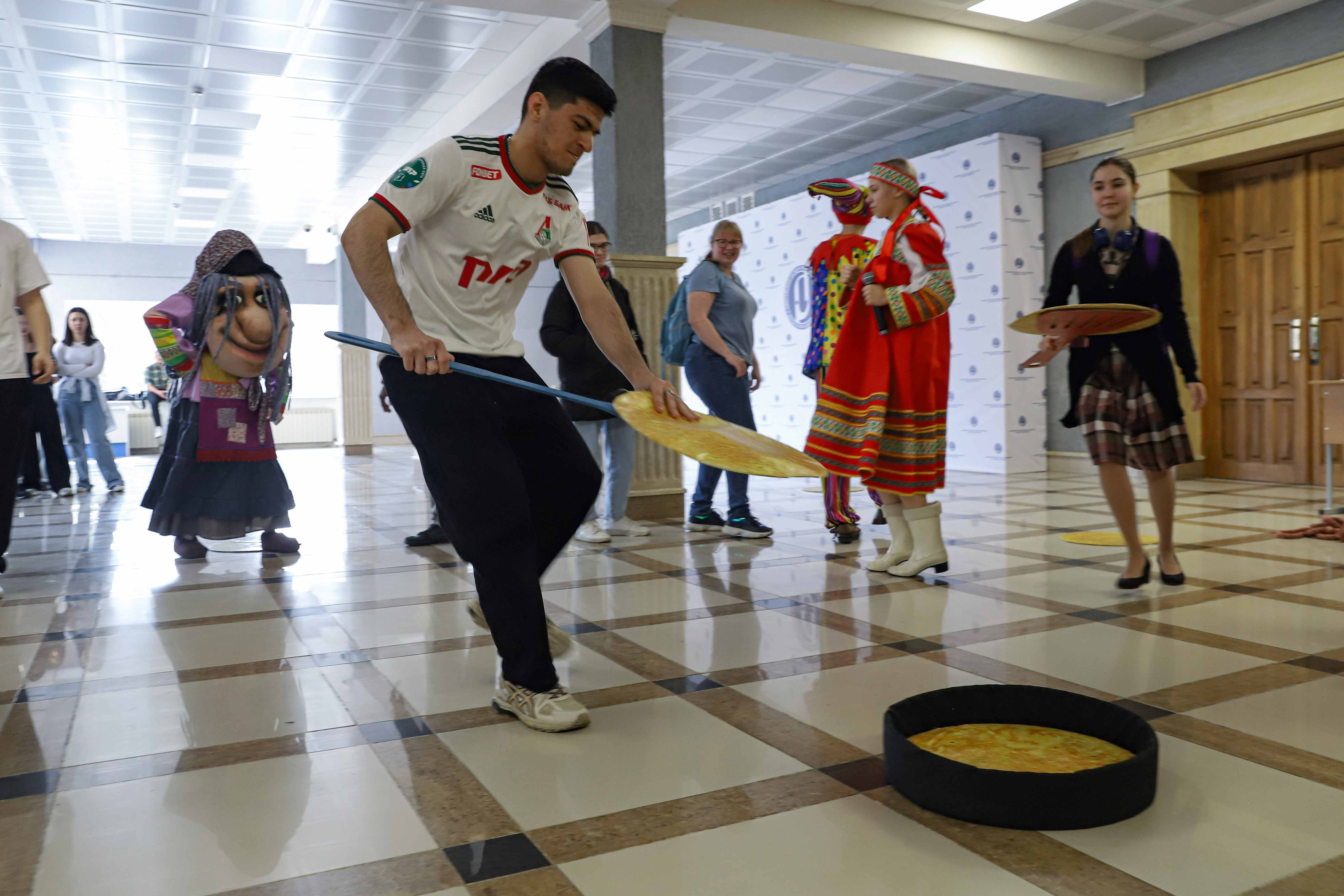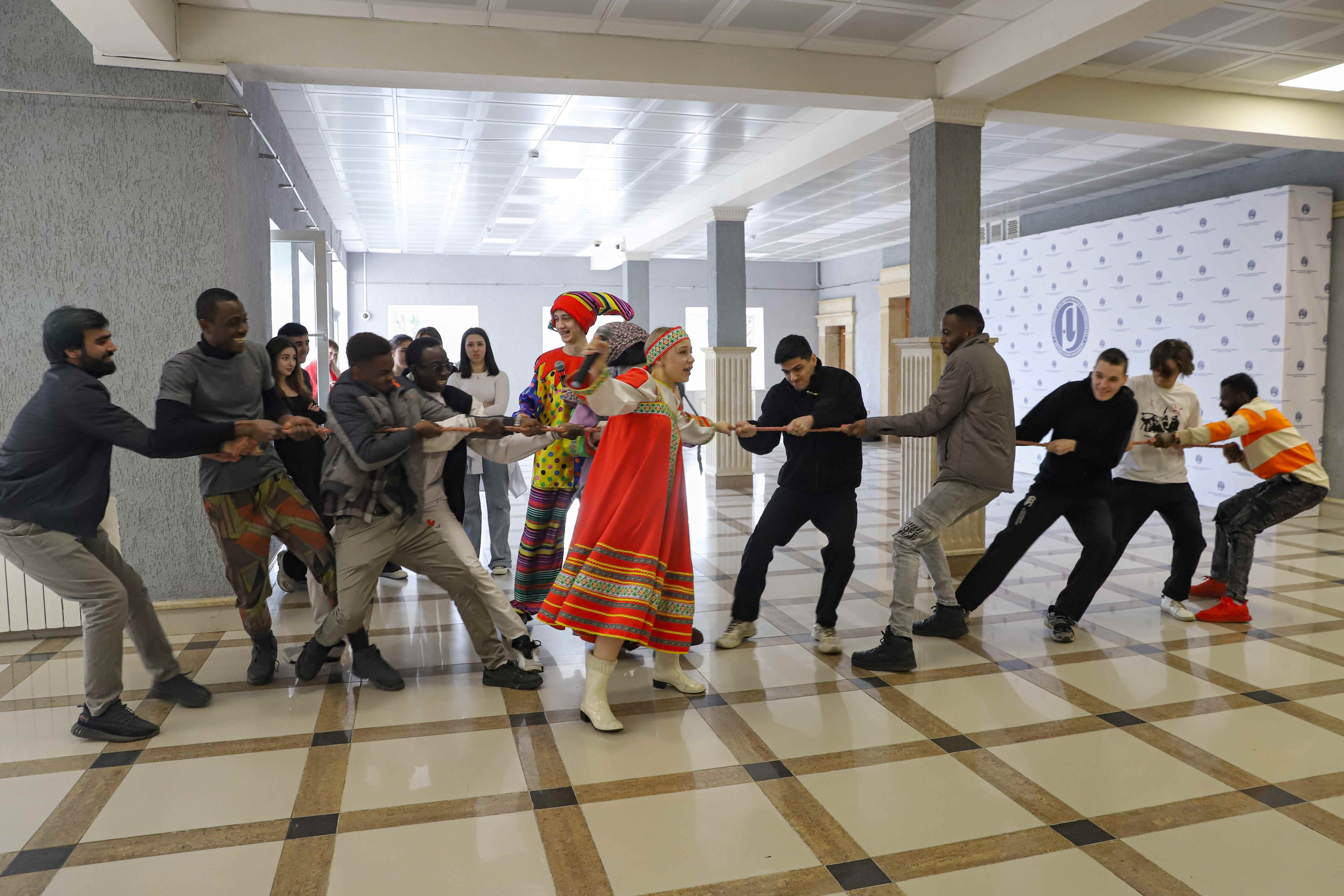 Масленица – хороший повод познакомить иностранных студентов с русскими традициями, которые не только с удовольствием дегустировали блины, но и вместе со своими российскими сверстниками водили хороводы, играли в масленичные игры и состязались в перетягивании каната.