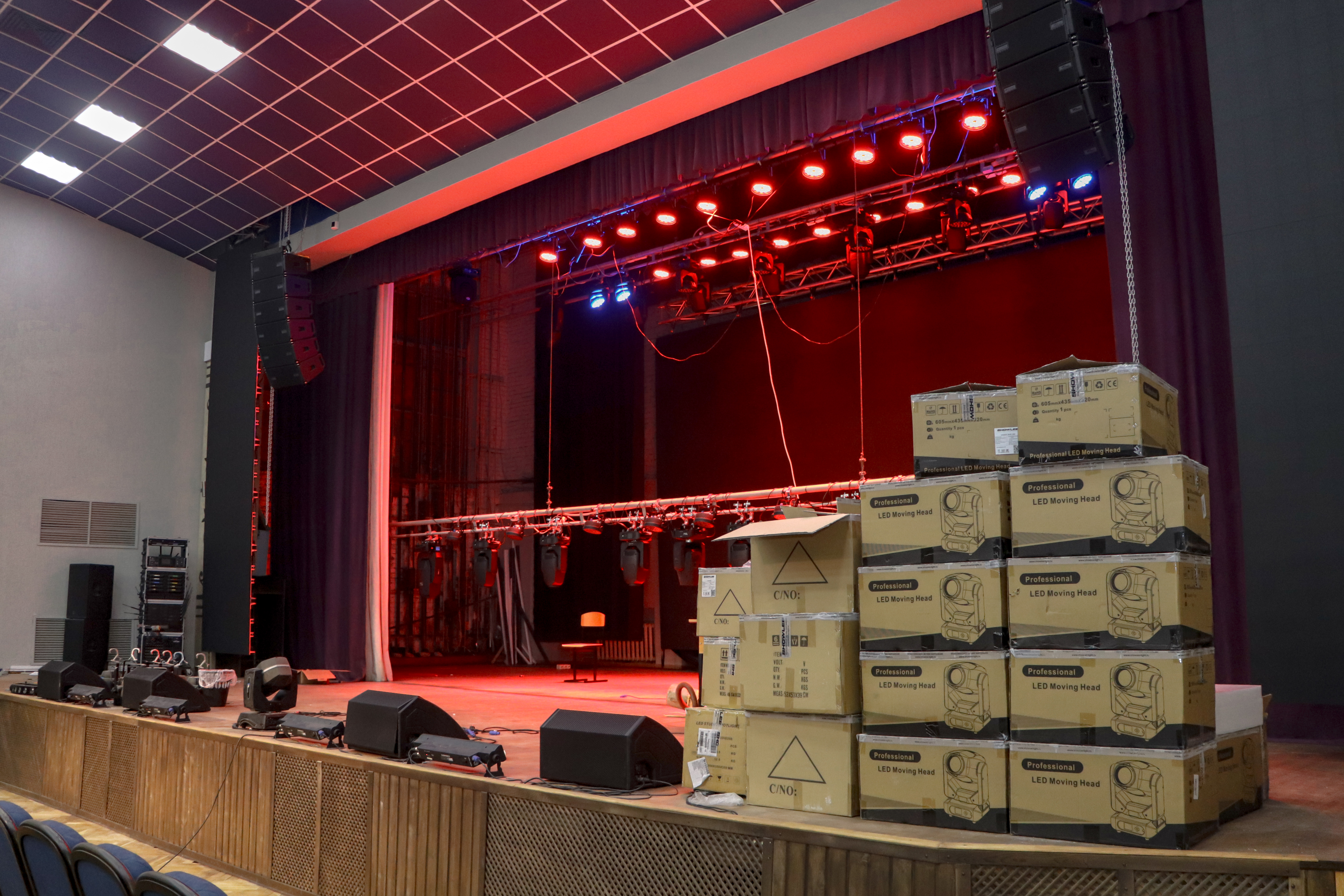 Для модернизации системы было закуплено 16 вращающихся спотов, 6 баров для фоновой заливки цветом, 4 прибора управляемых световых пучков WASH, пульт управления, который включает более 4 тысячи каналов управления - в 8 раз больше, чем в прежнем. Для коммутации оборудования под зрительным залом и над потолком специалисты Центра культуры АГУ проложили 2 км кабелей.
