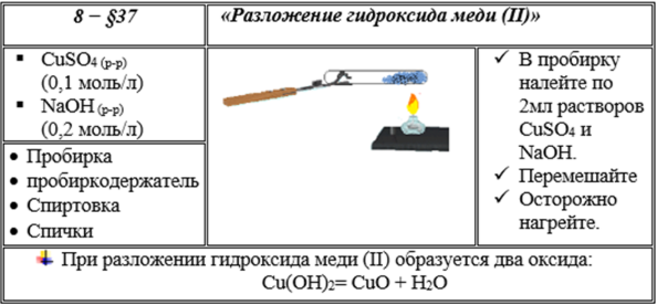 Педагогический эксперимент был реализован в процессе изучения темы «Основные классы неорганических соединений». Организация демонстраций осуществлялась с помощью специальных инструктивных карточек. В них содержалась информация о теме опыта, ссылка на соответствующий параграф учебника химии для 8 класса (автор Н.Е. Кузнецова), список необходимого оборудования и реактивов, пошаговый алгоритм действий, а также вопросы для контроля и закрепления материала (Рисунок 3).