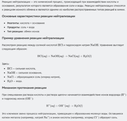 Рисунок. 1. Ответ нейросети "ГигаЧат" на запрос с просьбой объяснить, что такое реакция нейтролизации.